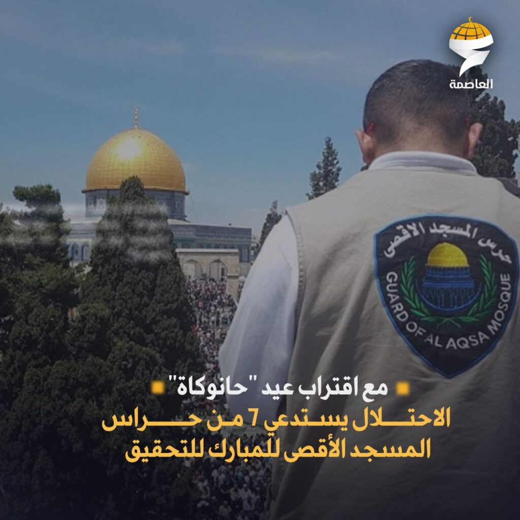 مع اقتراب عيد “الحانوكاة” العبري الذي يوافق 25 من الشهر الجاري وما يتزامن معه من تضييقات على المصلّين والمرابطين وتأمين اقتحامات المستوطنين، استدعت مخابرات الاحتلال 7 من حراس المسجد الأقصى المبارك للتحقيق