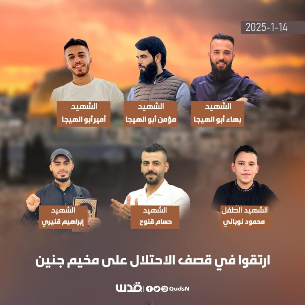 📌 الأشقاء بهاء ومؤمن وأمير أبو الهيجا وحسام قنوح وإبراهيم قنيري والطفل محمود نوباني.. الشهداء الذين اغتالهم الاحتلال ليلة أمس بقصف على مخيم جنين المحاصر من أمن السلطة.