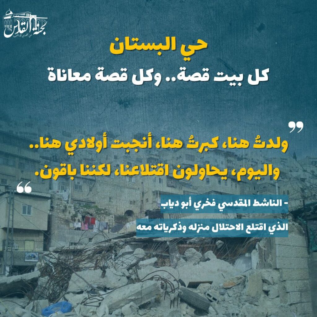 تصعيد خطير تشهده جرافات الاحتلال في حي البستان، حيث ارتفع معدل الهدم إلى مستوى غير مسبوق، فخلال العام الماضي فقط، سُوّيت 27 منشأة بالأرض، منها 21 خلال شهرين، لتصل الهجمة ذروتها في 2024، مهددةً أكثر من 115 منزلًا، يعيش فيها نحو 1500 مقدسي، في مسلسل تهجير قسري متواصل.