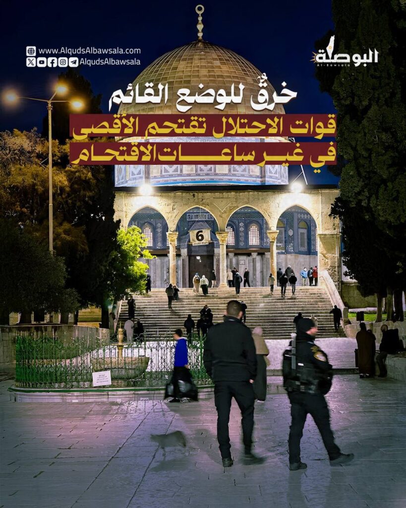 أحدث اقتحام وثقه مراسل “القدس البوصلة”، فجر اليوم، حيث تجول عناصر من شرطة الاحتلال أمام المصلى القبلي وفي مواقع أخرى، تزامنا مع صلاة الفجر.
