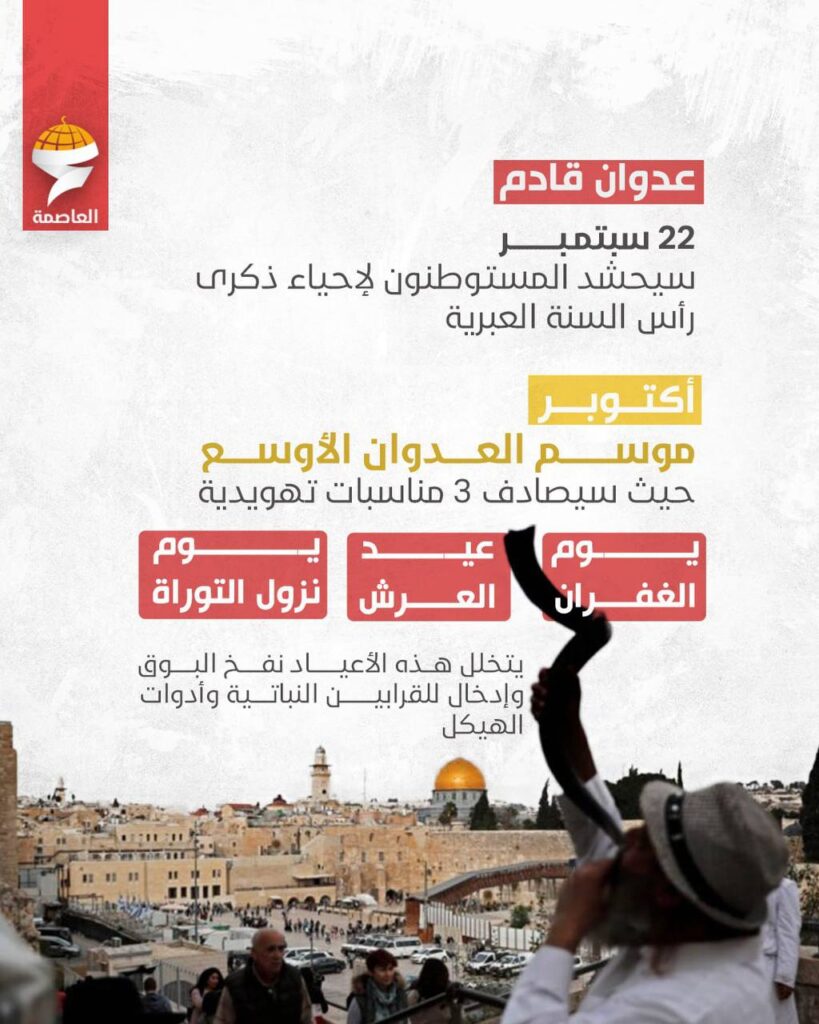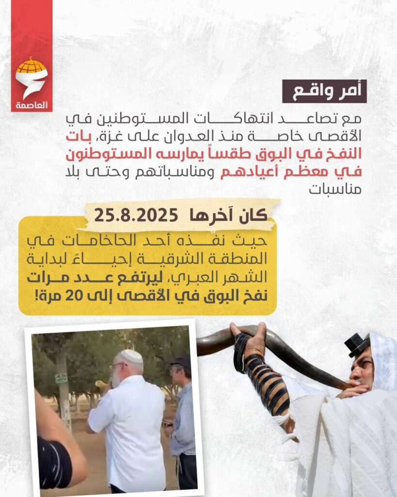 في 25 أغسطس 2025، نفخ حاخام يهودي البوق في ساحات المسجد الأقصى بحماية قوات الاحتلال، وهو أحدث حادثة من هذا النوع.