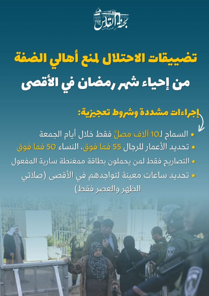 مع اقتراب رمضان، يستمر الاحتلال في تضييق الخناق على أهالي الضفة، محاولًا حرمانهم من الوصول إلى الأقصى في هذا الشهر المُبارك
