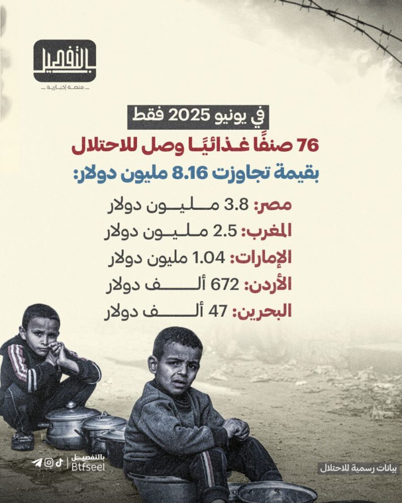 👈 تدفّق الغذاء العربي مستمر إلى الاحتلال!.. 76 صنفًا غذائيًّا وصلت من دولٍ مطبّعة، بقيمة 8.16 مليون دولار في شهر يونيو 2025 فقط.. إليكم التفاصيل