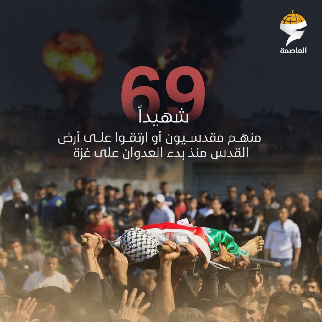 مع ارتقاء الشاب المقدسي طارق غزاونة من بلدة الرام برصاص الاحتلال على حاجز قلنديا صباح اليوم، يرتفع عدد الشهداء المقدسيين أو الذين ارتقوا على أرض القدس منذ بدء العدوان على غزة إلى 69 شهيداً