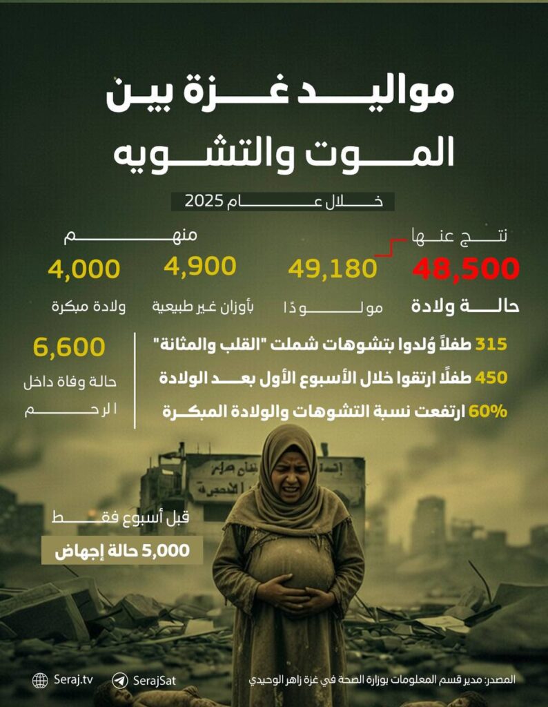 👈 أعداد المواليد بتشوهات وأوزان غير طبيعية والولادة المبكرة خلال عام 2025 كانت صادمة في القطاع. 👈الحرب هي السبب الرئيسي وراء هذه الحالات غير المسبوقة التي لم تكن موجودة بهذا الحجم قبل الحرب خاصة في عام 2022. 👈 النساء في غزة تعرضن لاستنشاق غبار وبارود الصواريخ عدا عن أن سوء التغذية والمجاعة أثّرا بشكل مباشر على صحة الأجنة. 👈انتشار مياه الصرف الصحي وانعدام النظافة زادا من المخاطر الصحية والأوضاع القاسية في الخيام فاقمت الأزمات الصحية للحوامل.