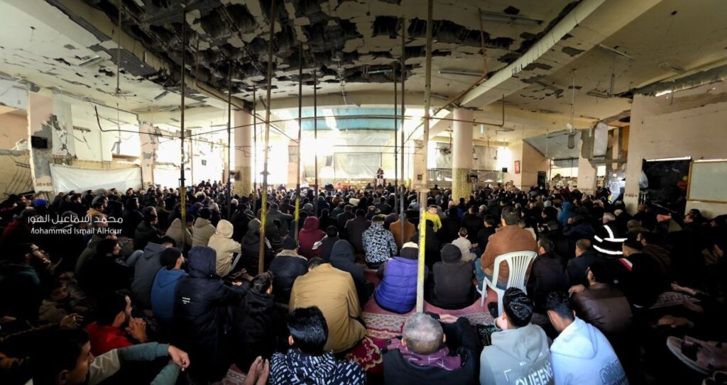رغم الدمار والقصف… أُقيمت صلاة الجمعة في “مسجد الفاروق” بمخيم النصيرات..