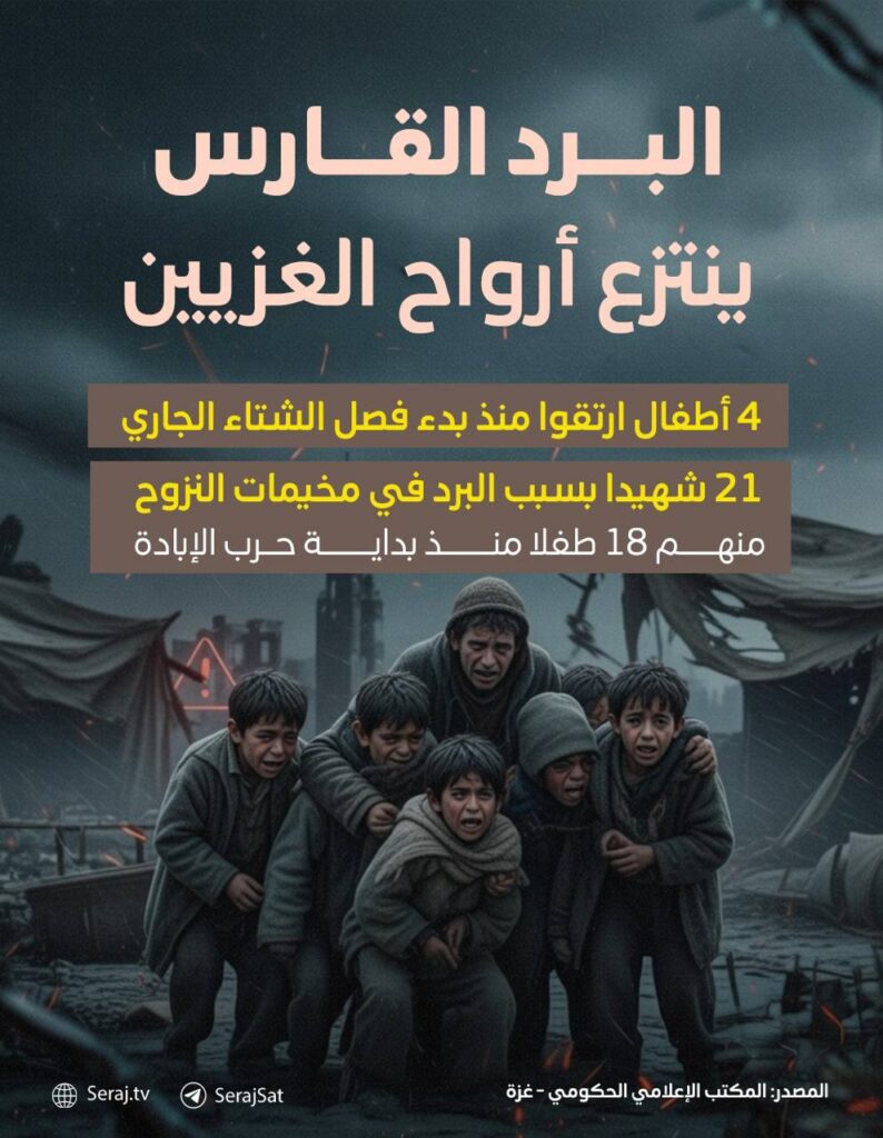 المكتب الإعلامي الحكومي في غزة: ▫️ وفاة 4 أطفال بسبب البرد الشديد منذ بدء فصل الشتاء الجاري. ▫️ 21 شهيدا بسبب البرد في مخيمات النزوح القسري منهم 18 طفلا منذ بداية حرب الإبادة.