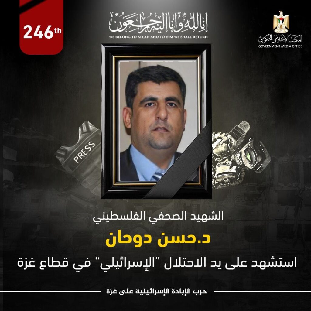 ارتفاع عدد الشُّهداء الصَّحفيين إلى 246 صحفياً بعد الإعلان عن استشهاد الصحفي حسن دوحان