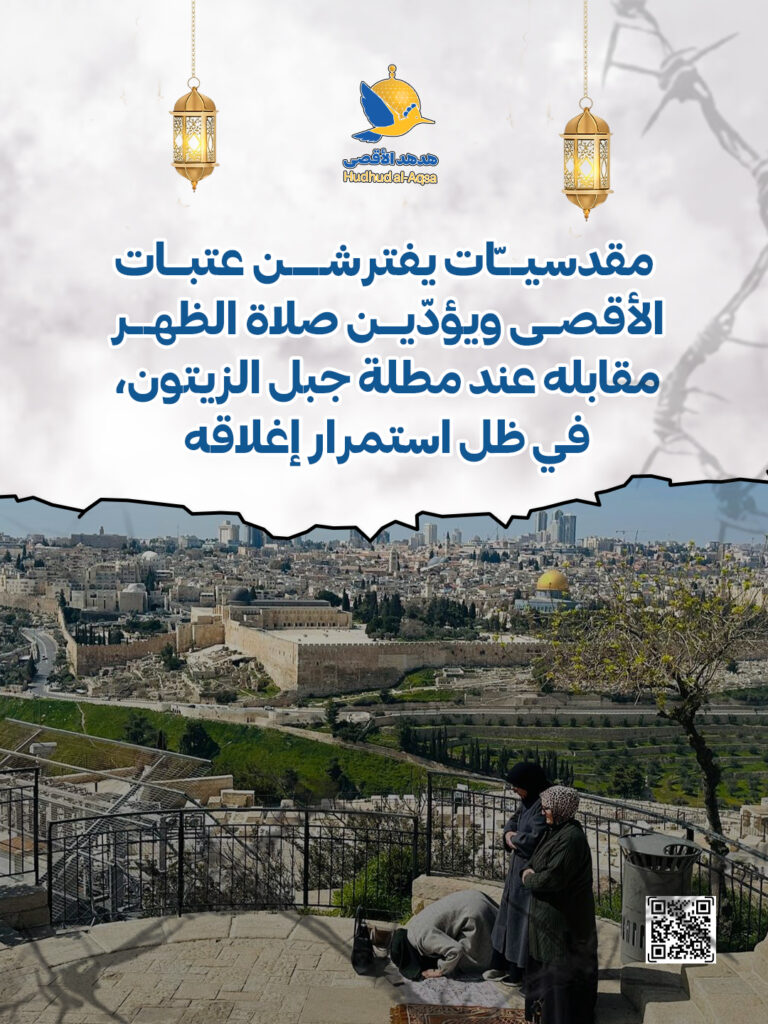 مقدسيّات يفترشن عتبات الأقصى ويؤدّين صلاة الظهر مقابله عند مطلة جبل الزيتون، في ظل استمرار إغلاقه ومنع دخول المصلين إليه بحجة “حالة الطوارئ”.