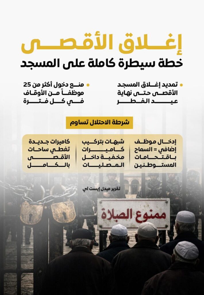 تمديد إغلاق الأقصى حتى نهاية عيد الفطر.. مع منع دخول أكثر من 25 موظفاً من موظفي الأوقاف إلى الأقصى في الفترة الواحدة