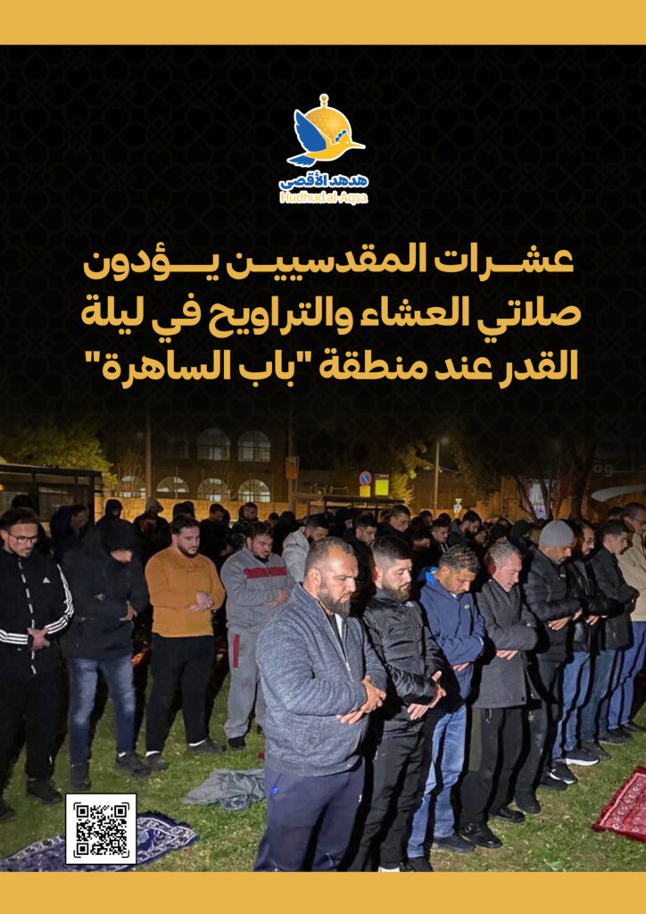 عشرات المقدسيين يؤدون صلاتي العشاء والتراويح في ليلة القدر عند منطقة “باب الساهرة” في القدس المحتلة، في ظل استمرار إغلاق المسجد الأقصى لليوم السادس عشر على التوالي..