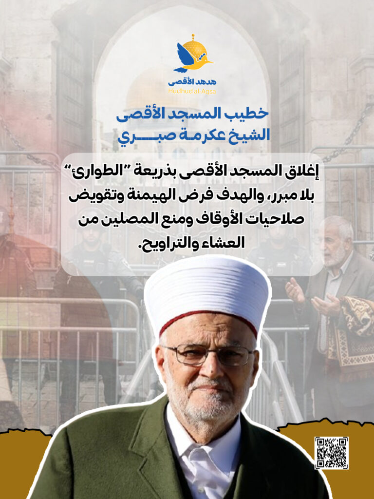 قال خطيب المسجد الأقصى ورئيس الهيئة الإسلامية العليا في القدس، عكرمة صبري، إنه لا مبرر لقرار سلطات الاحتلال إغلاق المسجد الأقصى بذريعة إعلان حالة الطوارئ، مؤكدا أن الهدف من ذلك هو فرض الهيمنة عليه. وأضاف صبري، في تصريح نقلته عنه /الجزيرة/ في اليوم الثاني لإغلاق المسجد ومنع صلاة التراويح، أن “سلطات الاحتلال تستغل أي مناسبة لإغلاق الأقصى، وهذا أمر غير مبرر أبدا”. ووفق بيان لمحافظة القدس الفلسطينية، اليوم الأحد، فقد واصلت سلطات الاحتلال إغلاق القدس والبلدة القديمة منها والمسجد الأقصى لليوم الثاني على التوالي، بذريعة حالة الطوارئ المعلنة منذ بدء الهجوم الأميركي الإسرائيلي على إيران فجر أمس السبت، مؤكدة استمرار منع المصلين والصائمين من الوجود في المسجد. وأوضح صبري أنه مع بدء الحرب أمس السبت، تم إخراج جميع المصلين وموظفي المحاكم الشرعية والمدارس، ولم يبقَ في المسجد سوى الحراس، وأُغلق أمام المصلين. وقال إن إغلاق المسجد يعني “هيمنة من الشرطة بحجة أمنية، وهذا غير مبرر ولا داعي له، ويتعارض مع حرية العبادة، ويوحي بأن سلطات الاحتلال تتحكم في المسجد، وتسحب صلاحية الأوقاف الإسلامية (التابعة للأردن) من إدارته”. وأشار خطيب الأقصى إلى أن استمرار إغلاق المسجد يحرم عشرات الآلاف من المسلمين الحريصين على أداء صلاتَي العشاء والتراويح. خطيب المسجد الأقصى ورئيس الهيئة الإسلامية العليا في القدس، عكرمة صبري