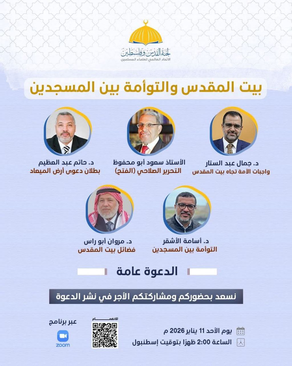 في ذكرى الإسراء والمعراج وإحياءً لأسبوع القدس العالمي، تدعو لجنة القدس وفلسطين بالاتحاد العالمي لعلماء المسلمين جميع العلماء والدعاة وطلبة العلم الشرعي، إضافةً إلى المهتمين من الرجال والنساء، لحضور الندوة الإلكترونية الخاصة بعنوان: