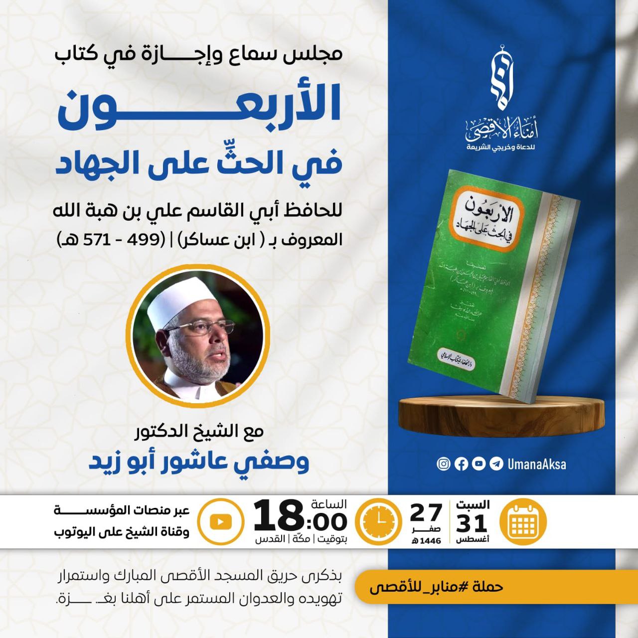 ⏰ الساعة 18:00 بتوقيت القدس ومكة / 16:00 بتوقيت بلاد المغرب العربي.