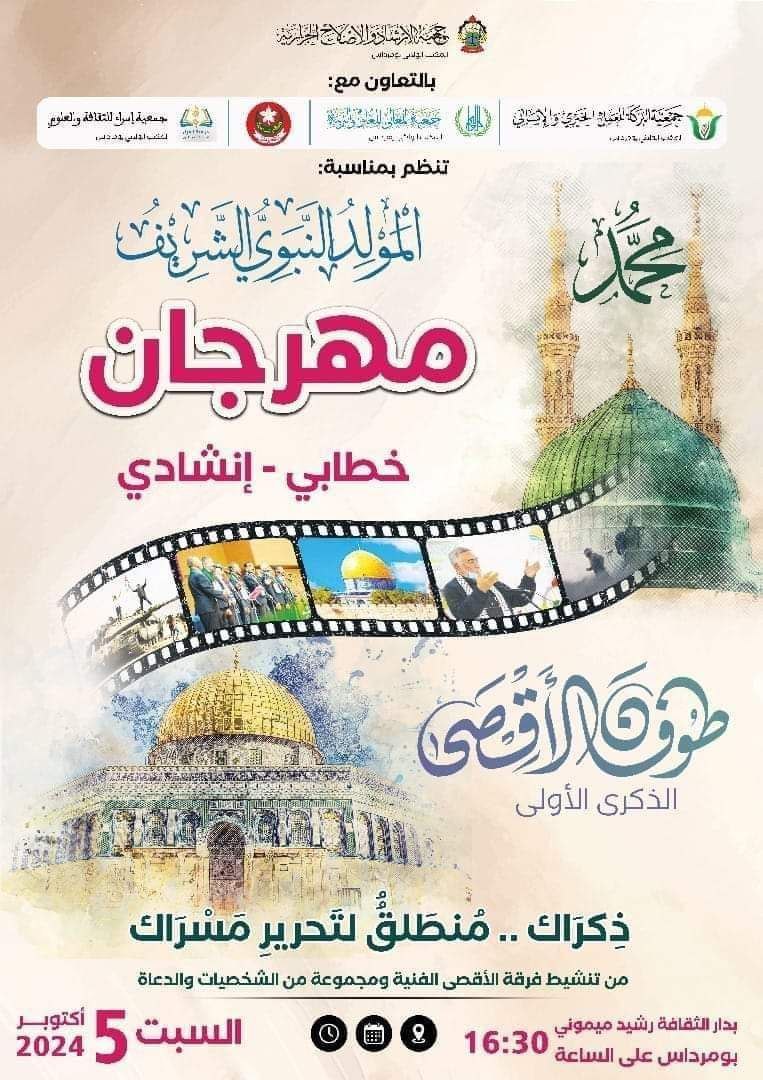 بمناسبة الذكرى الأولى لطوفان الأقصى تنظم جمعية البركة للعمل الخيري والإنساني وجمعية إسراء للثقافة والعلوم وجمعية المعالي للعلوم والتربية والكشافة الإسلامية الجزائرية لولاية بومرداس مهرجان خطابي إنشادي بمناسبة الذكرى الأولى لطوفان الأقصى