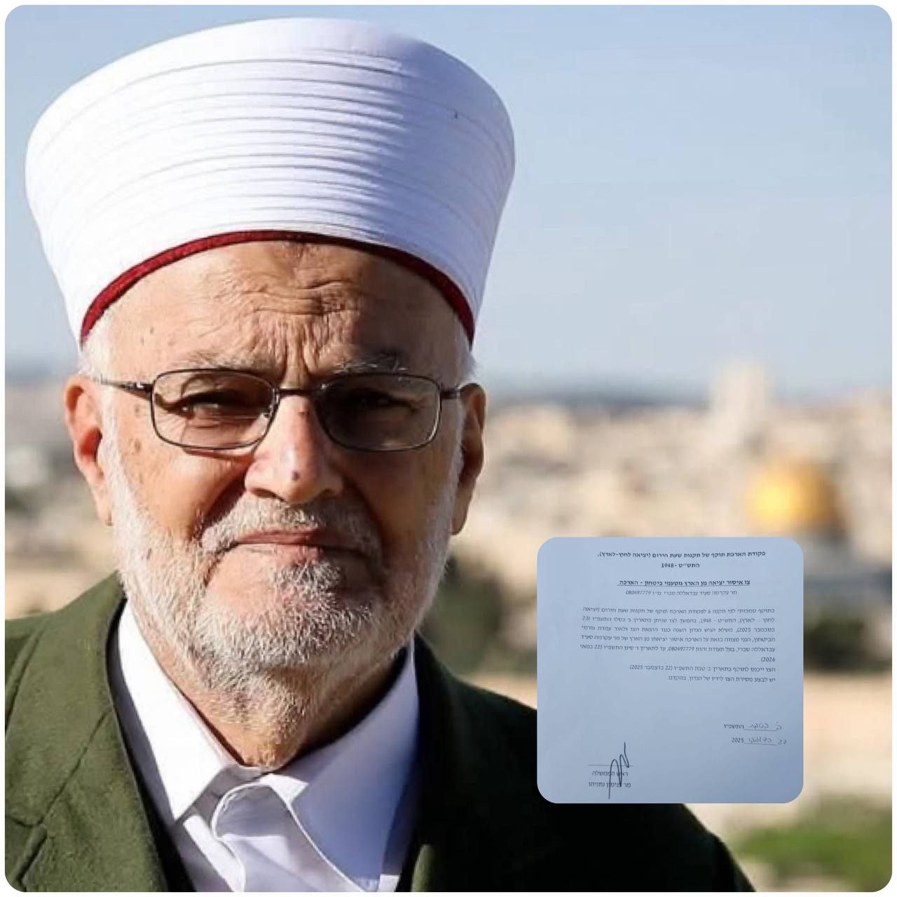 قام الكيان الصهيوني بتسليم الشيخ عكرمة صبري قرار بمنع السفر حتى نهاية شهر5 وبهذا يكون