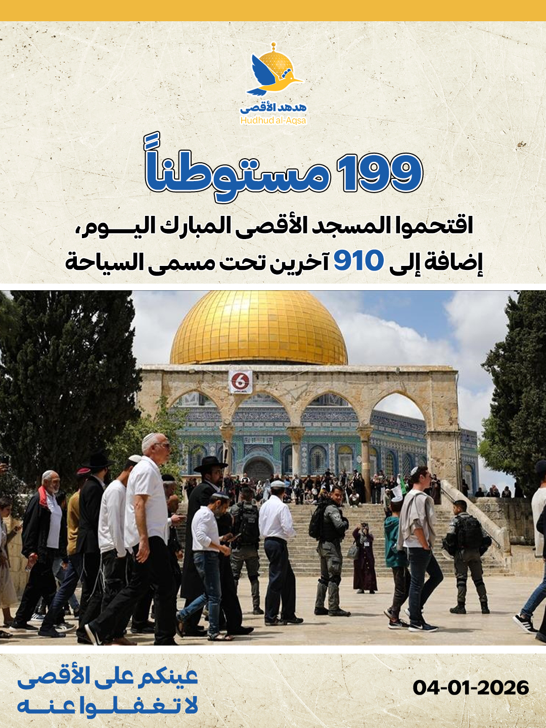 199 مستوطناً اقتحموا المسجد الأقصى المبارك اليوم، إضافة إلى 910 آخرين تحت مسمى السياحة مستوطنون